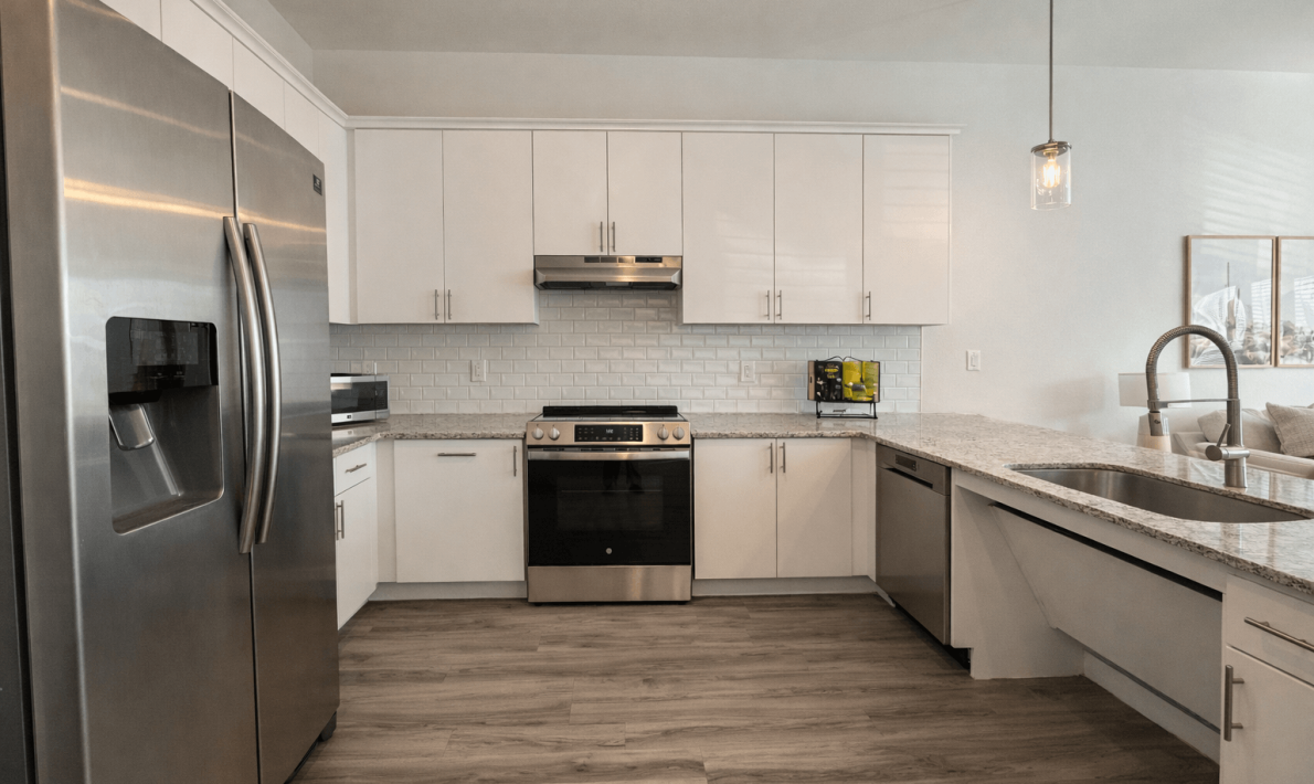 Each home will boast modern features and finishes, including granite countertops, Samsung stainless steel appliances, tile backsplashes, oversized tubs, hardwood-style and tile flooring throughout, lofty 10′ ceilings, and full-size washers and dryers.